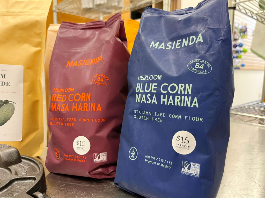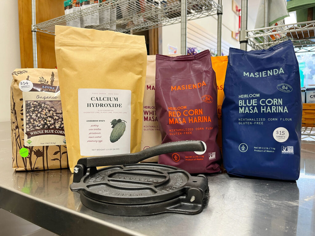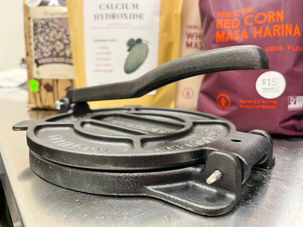 Have you seen that we now carry masa harina made from heirloom corn? It’s delicious and seriously a step above what you can buy elsewhere. If you’re at all interested in making tortillas, keep reading and then head down to Harvey’s to get your masa and a high-quality cast iron tortilla press!